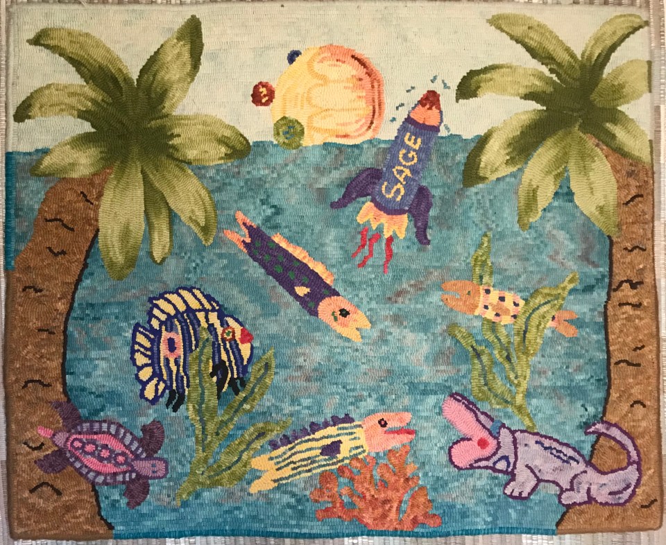 IMG_7175 ← Previous Next → Julie designed this one, hooked by Joanne, for one of our son’s earlier birthdays, back when he wanted to be a marine biologist in the tropics, intrigued by science and imagined himself as an Olympic swimmer!