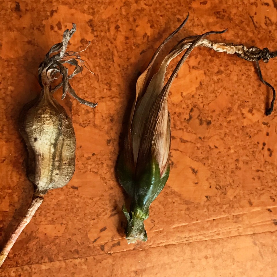 IMG_7285 ← Previous Next → Dried fruits typical of Lily family members, each 3 chambered with flattened seeds stacked one atop the other, Beschorneria on the left, Puya mirabilis on the right.