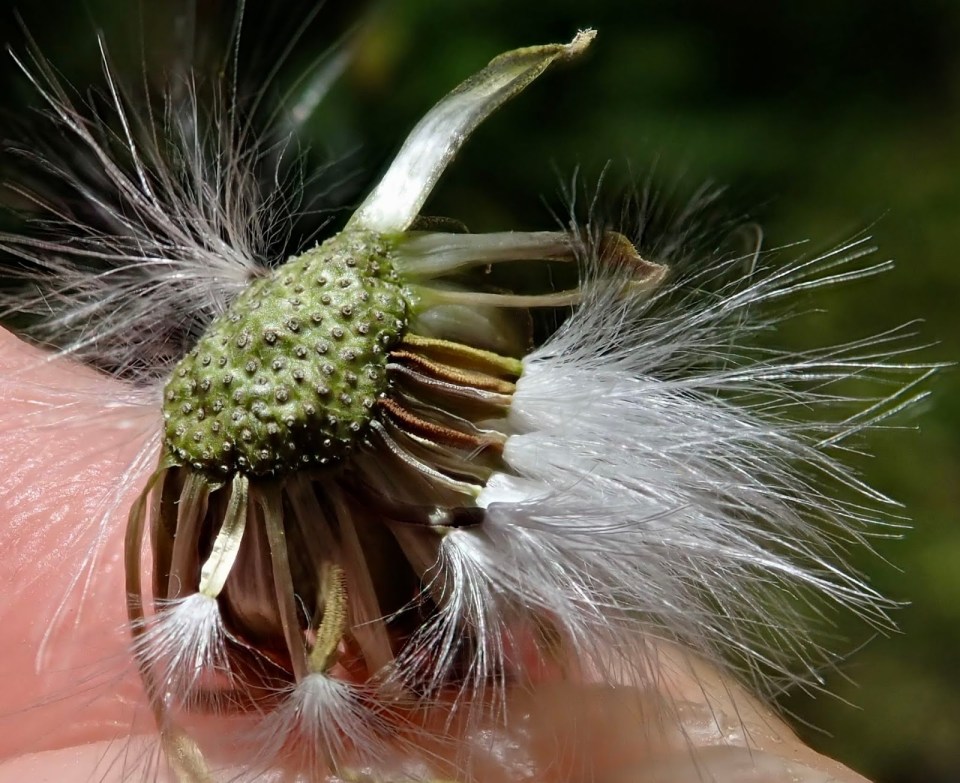 This pic shows the remaining seed of Sonchus canariensis, the typical slender achene of the Aster family, still clinging to the rim of the receptacle with their pappus expanded to help carry them away on the breeze. I found this picture on the blog, “Violets and others: Wild flower photos by Peter Leonard”, in a posting on March 26, 2019, titled, “Sonchus canariensis in Tenerife”, pictures he took while visiting the island. https://cambridgewildflowers.blogspot.com/2019_03_26_archive.html?m=0