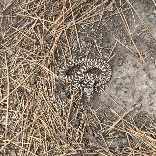 A Diamond Back Rattlesnake we met on the trail in Central Oregon, still too young to have any rattles, coiled amongst dropped Ponderosa Pine needles. As different as their structures may be they still share an amazing amount of patterns at a cellular level. While the ‘hard’ structure of the needles remain, the live cellular tissues are degraded and desiccated. They cannot be resuscitated. Their trees have sacrificed them, actively, having formed an abscission layer between the tree’s permanent vascular structures and the fascicles, the bundled structure binding the individual needles together. Leaves are all limited life structures that plants commit limited resources to. When their life span is over or their useful capacities are compromised, they are sacrificed. Most animals, like this Rattle Snake, are more invested in the longevity and health of their own tissues and have evolved strategies to sustain them over the longer term, replacing whole cells or replenishing individual proteins within them. More complex animals do still shed or sacrifice cells, especially those protective tissues, such as skin, scales, hair and feathers in addition to those lining their digestive and respiratory tracts. Plants do this as well continuously shedding and replacing hair roots as they ‘search out’ water and nutrients. Patterns are shared as are strategies. In case you were wondering the wedge shaped heads of vipers, the broad base where their lower jaw attaches, house their venom sacks. The snakes can control the amount of venom they release, delivering a ‘dry bite’ if they have no intention of trying to consume their target as prey, increasing the amount when prey is larger. Once spent the venom takes time to replenish and is therefore ‘valuable’. The delivered venom helps with the snakes later digestion of the prey as it begins to break the target’s proteins and tissues down as their hearts continue to pump it, with their blood, throughout their bodies. The poison takes some time before the prey dies and the snakes are required to follow after. This affords the snakes some degree of safety if the prey is itself dangerous. Younger vipers, like this Rattler lack the experience to know this and may inject too much poison. Additionally, their lack of rattles makes them more dangerous as humans may unwittingly stumble into them. Don’t count on a ‘dry bite’ from either an adult or juvenile Rattler!