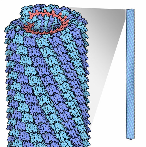 A model of the Tobacco Mosaic Virus molecule. The red is the enclosed RNA, its genetic material, the rest is the protective capsid constructed of individual protein molecules like bricks into an overall ‘rod’ shape. -