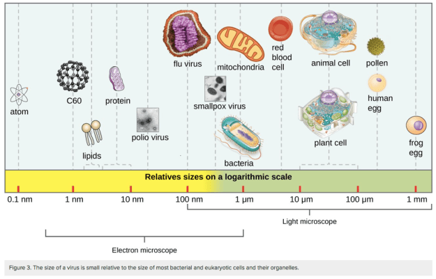 Viruses are far tinier ‘bits’, sometimes referred to as ‘viral particles’, because they are not cells. Individually they are called ‘virons’. Our knowledge of viruses was very limited before the invention of the electron microscope in 1931. The first virus ever identified was the virus that causes Tobacco Mosaic Disease. There was much interest in it as the disease was responsible for major crop losses. It wasn’t until 1935, with the electron microscope’s much greater magnification abilities, that it was positively identified. The earlier ‘light’ microscope with its optical lenses was unable to magnify viruses enough to even see them, let alone study them. Most viruses are on the order of 100 times smaller than a typical bacteria, which we can see through a light microscope. Viruses make up for their small size by their shear numbers. They far out number all forms of life on Earth. As tiny as they are scientists have estimated from sampling the oceans, that if you could collect every one in them, and lay them, end to end, they would form a ‘string’ 100 million light years long….Considering that the sunlight takes just over 8.5 minutes to travel to Earth, a distance of only 93 million miles, and you begin to understand just how common they are. [100 million light years, the distance light travels in one year, translates into 586,569,600,000,000,000,000 miles…and most virons, are 10 to 100 nanometers in size, a nanometer is one billionth of a meter. With 1,606+ meters per mile it would require around 10 to 100 million take just to stretch across a single meter, 1.606 x 109-10 virons! Now, multiply that by the miles in a 100 million light years to approximate the number of individual virons…expected to be found in the ocean only. Every living cell contains some.]
