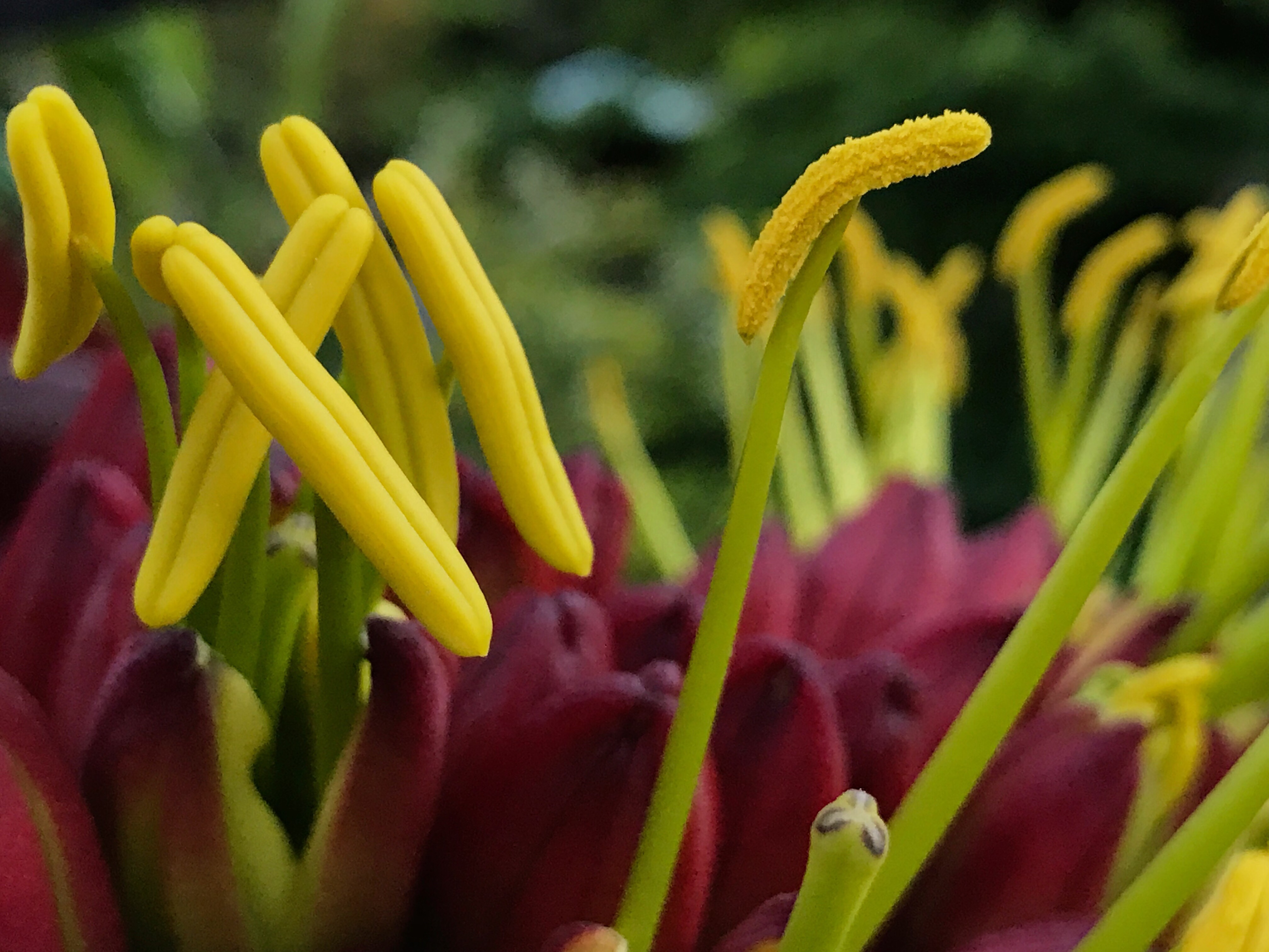 May 8 Most of the anthers here are undehisced, still holding their pollen. All of this has to be well timed so that the developing pollen, which contains the male gametes for reproduction, have had time to mature. These anthers split open along the line and turn inside out exposing their pollen which here looks ‘rough’.