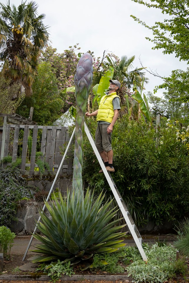 Evaluating. At this point, measuring from where the stem begins to flare out, enclosing the developing crown of the panicle, the ‘bulb’ is 42″ tall, while the overall height is about 154″, it has been extending almost 2″/day since the 16th when it began a major spurt.