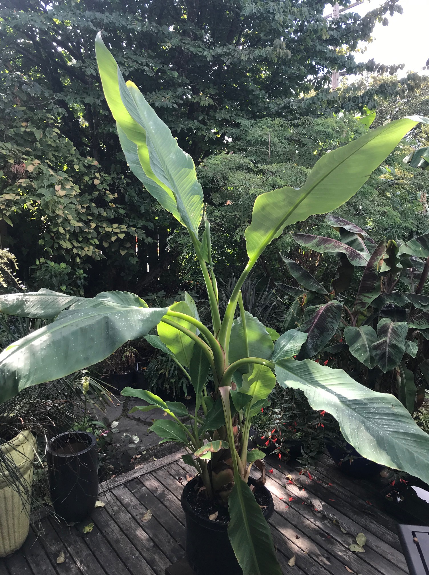 I’ve been growing Musella in a larger pot as well. It performs much as it does in the ground reaching similar size, getting along with comparatively little water. This plant suffered no leaf scorch even during our record breaking streak of 108º, 110º and 116º in late June ’21. It was protected in shade in the afternoon. Here it sits on the deck next to my Musa accuminata ‘Zebrina’, a Malaysian tropical, which did suffer a lot of marginal leaf burn, losing several of its softer, newer, leaves, even with daily watering of its pot during the hottest stretch (It quickly recovered after the temps settled down.).