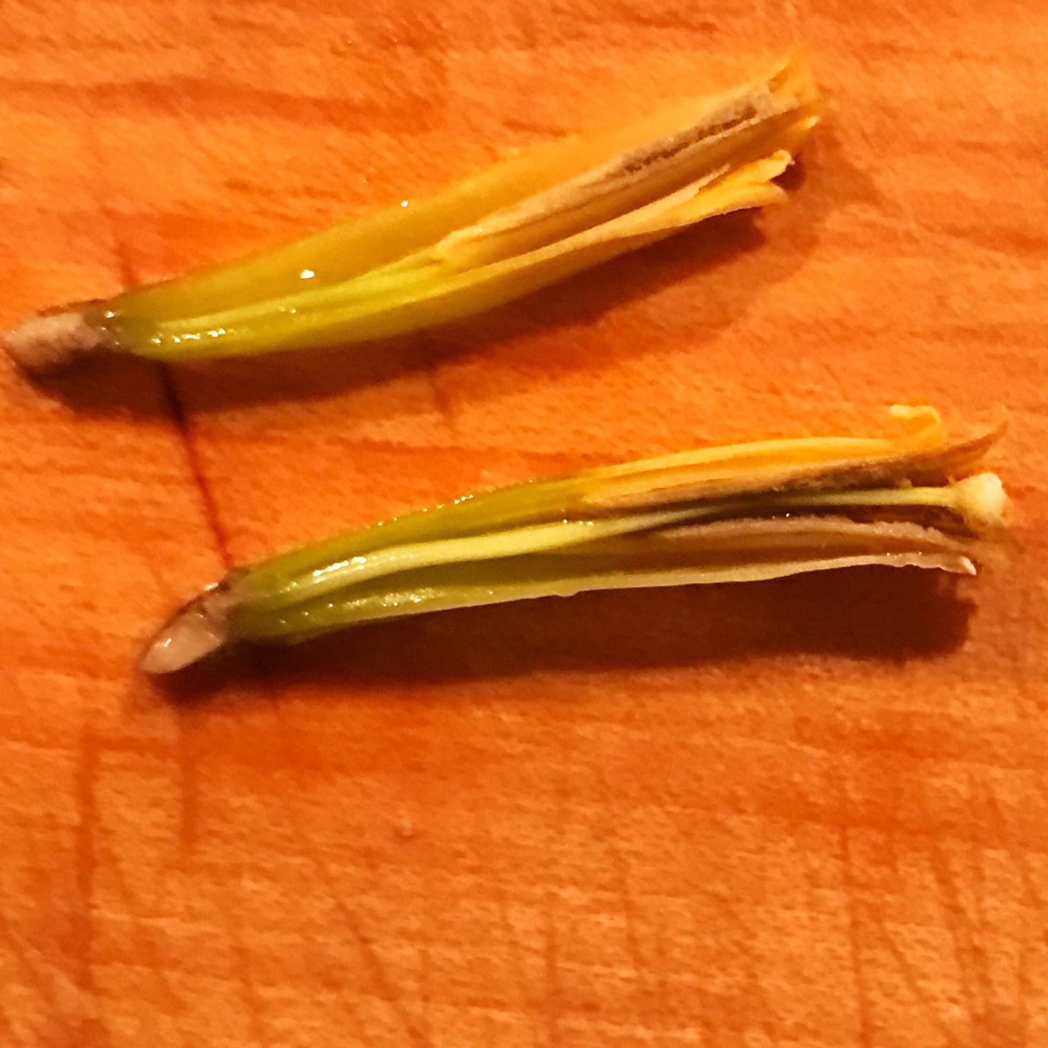 An individual female flower dissected in the first few weeks of flowering. None of the anthers are developed. One large, swollen, stigma sits on top of its style just protruding from the corolla. The cut surfaces are wet with nectar which these produce in abundance.