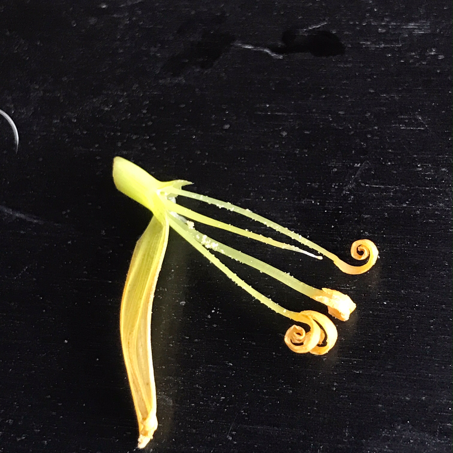 IMG_1615 ← Previous Next → A male flower I removed in early September from which I removed two obscuring petals. Here the matured anthers have dehisced, releasing their pollen, some of which has stuck the filaments of the stamen.