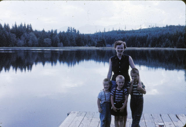 Summer of ’57 at Henderson Lake, Vancouver Island, BC. My mother, myself, the littlest one, and two brothers, Kirk in the middle, Bruce on the right. In the 1950’s suspenders were still de rigueur…especially for little boys with bellies and pants without stretchy wastebands.