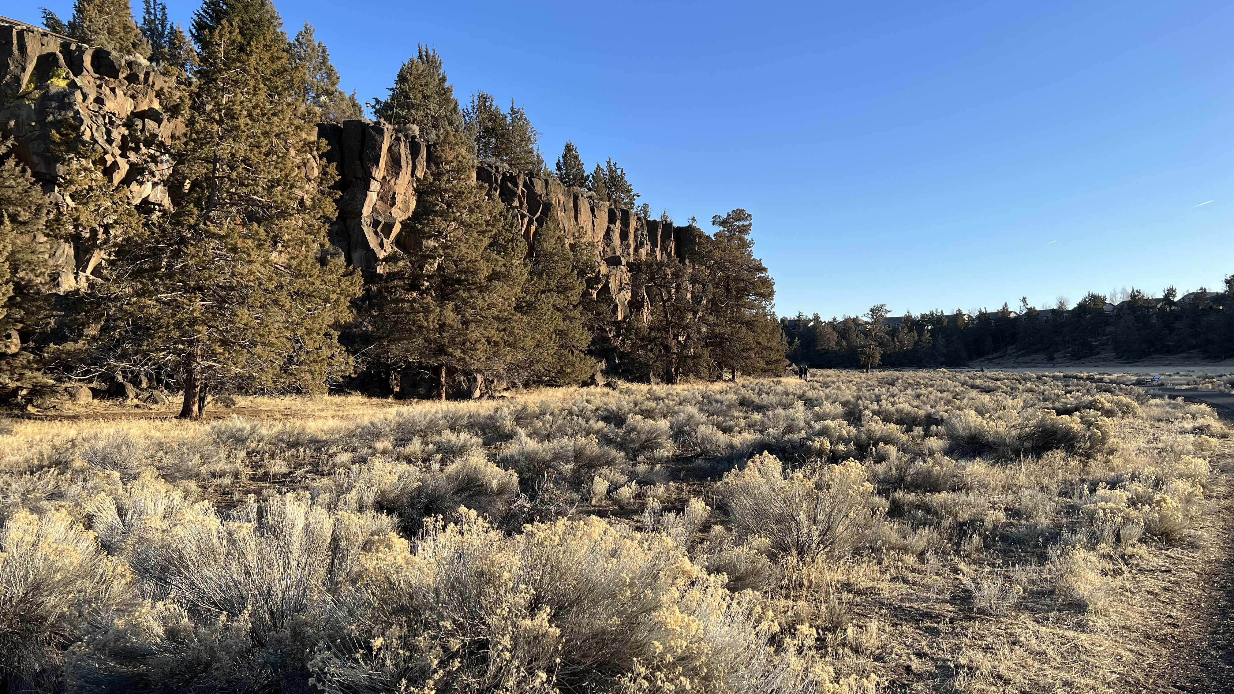The Dry Canyon in Redmond, Oregon, which for 200-300,000 years contained an earlier version of the Deschutes River. The rivers course was changed by an eruption from the Newberry Volcano, a massive shield volcano with over 400 vents 40+ miles to the south. A later eruption partially filled the canyon with lava. In this section the canyon was filled raising its floor so that it’s around 70′ deep, its two rims separated by about 700′.