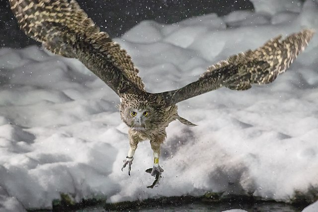 A male Blakiston’s Fish Owl after having fed takes flight to bring a fish to his mate on the nest. from Wiki.