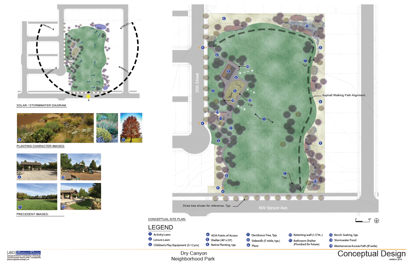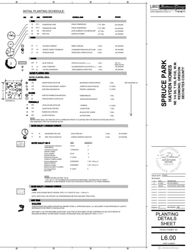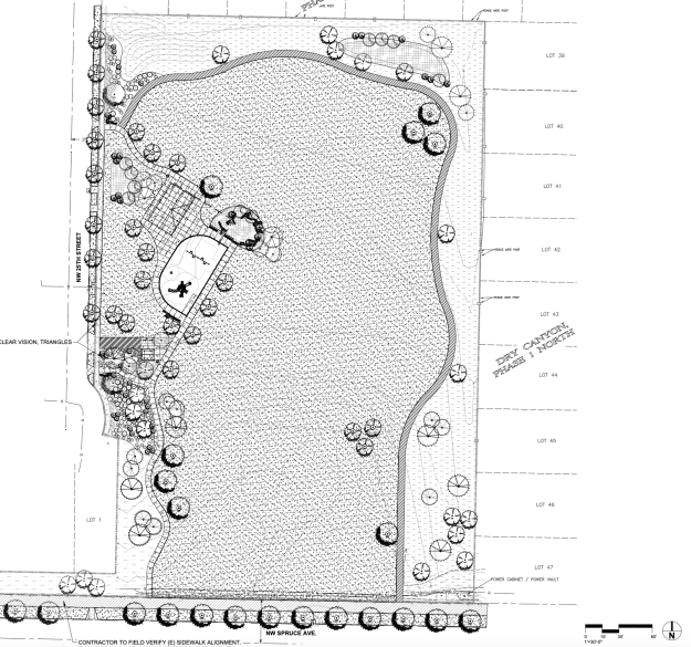 My wife and I are in NW Redmond, west of Dry Canyon which contained a river for 300,000 years, blocked some 78,000 years ago by the Basalt of Bend,a lava flow from the Newberry Volcano south of Bend, followed by another flow 3,000 years later that partially filled the canyon all of the way to Lake Billy Chinook. Our immediate area not long ago was still ‘hobby’ farms and smaller acreages, but has been rapidly suburbanizing over the last ten years. Across the street from us, still under construction, is 4 acre, Spruce Park. I began writing this critique in March, late winter here. Most landscape work ceases locally with the onset of winter, the ground freezing (Water lines are installed 3′ deep). Hydroseeding of the large central turf area didn’t happen last Fall as scheduled, the bales of material were stacked under shelter all winter (The hydroseeding was done in mid-April with low temperatures still dropping to the mid and low 20’sºF).