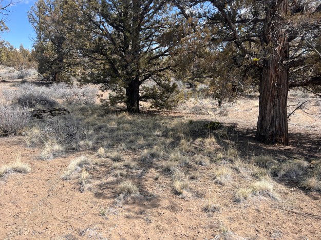 Idaho Fescue is common in Juniper Forest country, which historically were mostly limited to rocky outcrops, where lavas once flowed at the surface and still remains mostly above it, as well as on slopes. Fires were less frequent on such sites, thinner soils supporting less flammable ‘fuels’, fewer grasses and shrubs. A walk through a Juniper forest such as that around Cline Buttes, can quickly educate a person about the existence of ‘bare’ surface soil in such an arid place. Water and the lack thereof, strongly determine the plant communities here, their diversity and density. Much of the BLM lands in the Cline Butte area have a long history as Juniper forest with trees estimated to be as old as 1,000 years. The broader flats, often with deeper soils, historically tended to be dominated by grasses and Sagebrush communities, the Juniper component limited by fire.