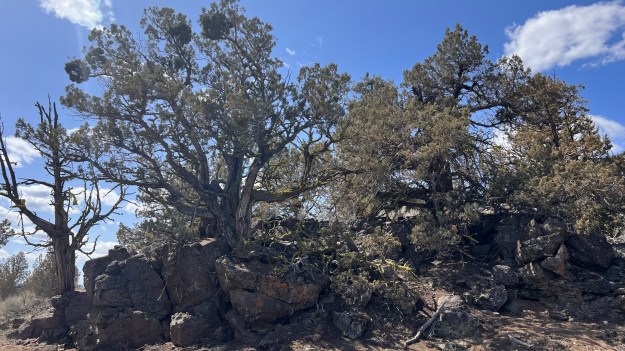 A site west of Redmond and the Deschutes River, south of Cline Buttes in old growth Juniper Forest with trees estimated to be as much as 800 and more years old. Here these are growing on the leading edge of a lava flow, which cooled and thickened enough here to halt its forward advance.