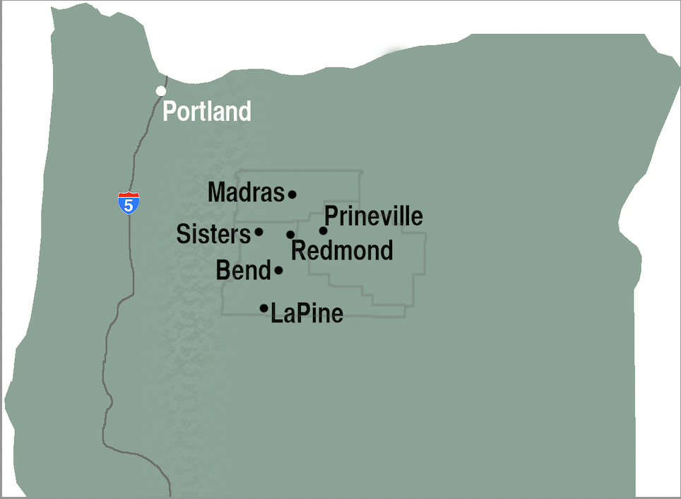 Central Oregon with its county delineations and primary cities. Madras and Jefferson county, Prineville and Crook county, each contain about 25,000 people, combined make up about a 1/5 of the Central Oregon total.
