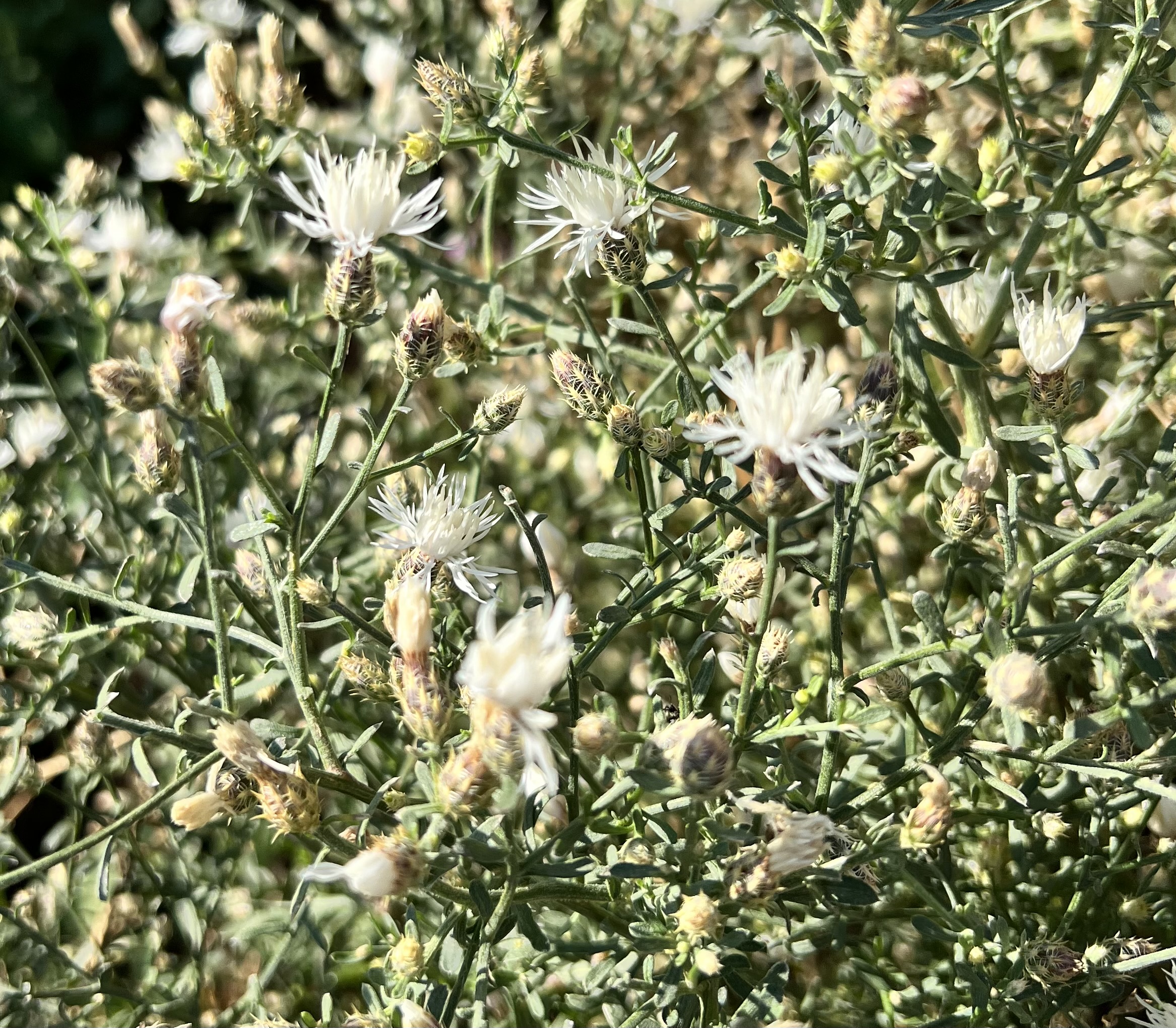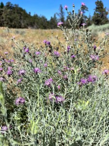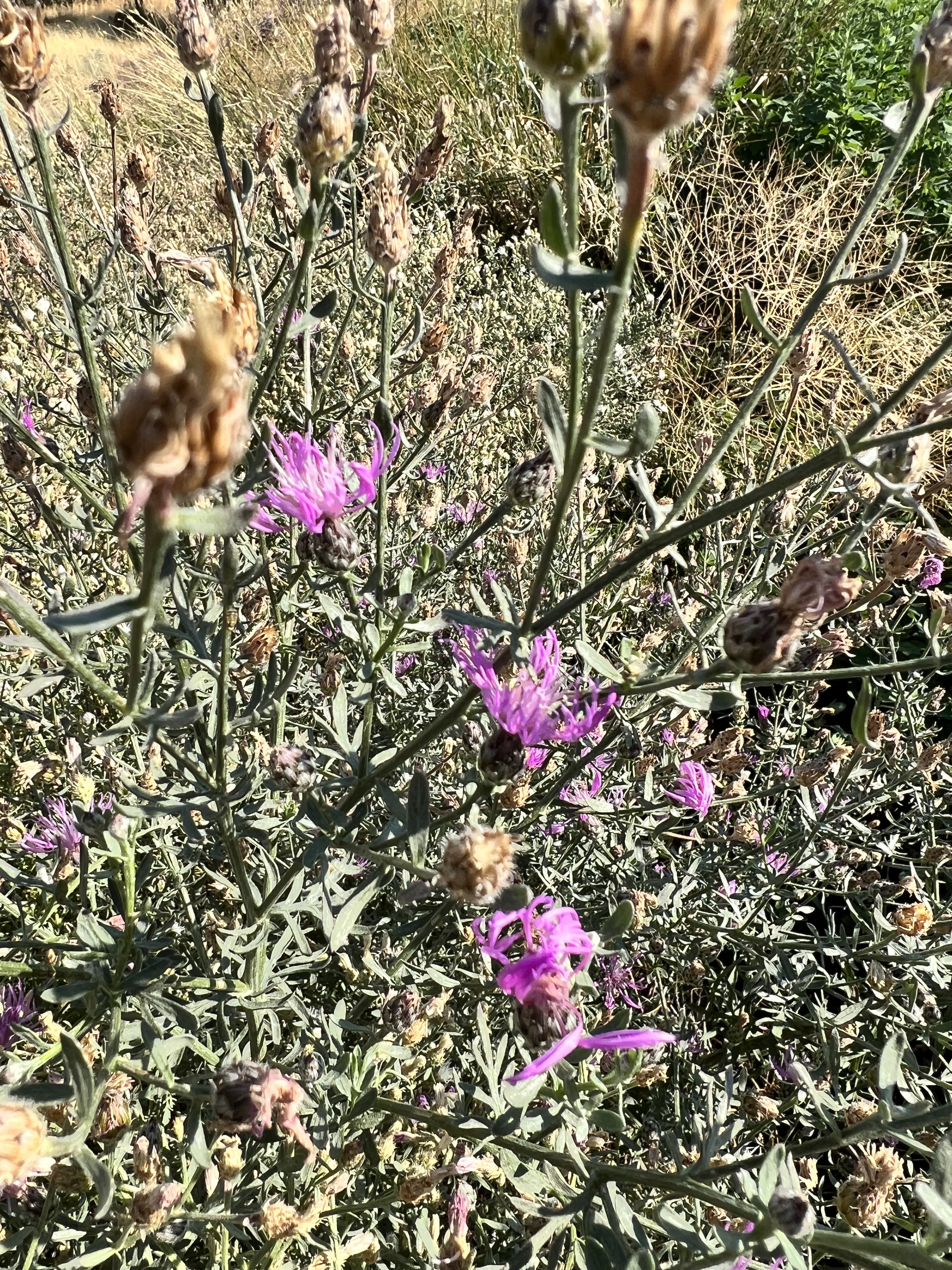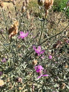 I’ve found a handful of sites within the Canyon, north of Highland, with Knapweed growing and flowering. Several are north of the Maple Bridge and are small. I pulled and cut them. I’ve pulled others at the top of the stairs adjacent to the Bridge at Hathaway Park. A few others are doing similarly. There are many acres to monitor. There is a much larger and more established population of Spotted and Diffuse Knapweed adjacent to the paved path, west of the Playground in Sam Johnson Park and next to the Pickleball courts. Outliers exist around these central contamination points. Here it grows so dense that only the occasional Common Mullein, Verbascum thapsus, can compete. (Mullein is itself another invader tolerated and even promoted by some. It’s another Eurasian escapee and competes with natives for space, water and nutrients here.)