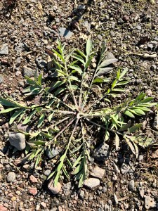 First year rosettes cover much of the ground below the flowering plants which tend to be biennial or short lived perennials. They are very heavy seed producers. The previous year’s top growth adds its dead bulk to the mess. Because seed remains viable for seven years or so this site will require regular monitoring and control to eliminate it.