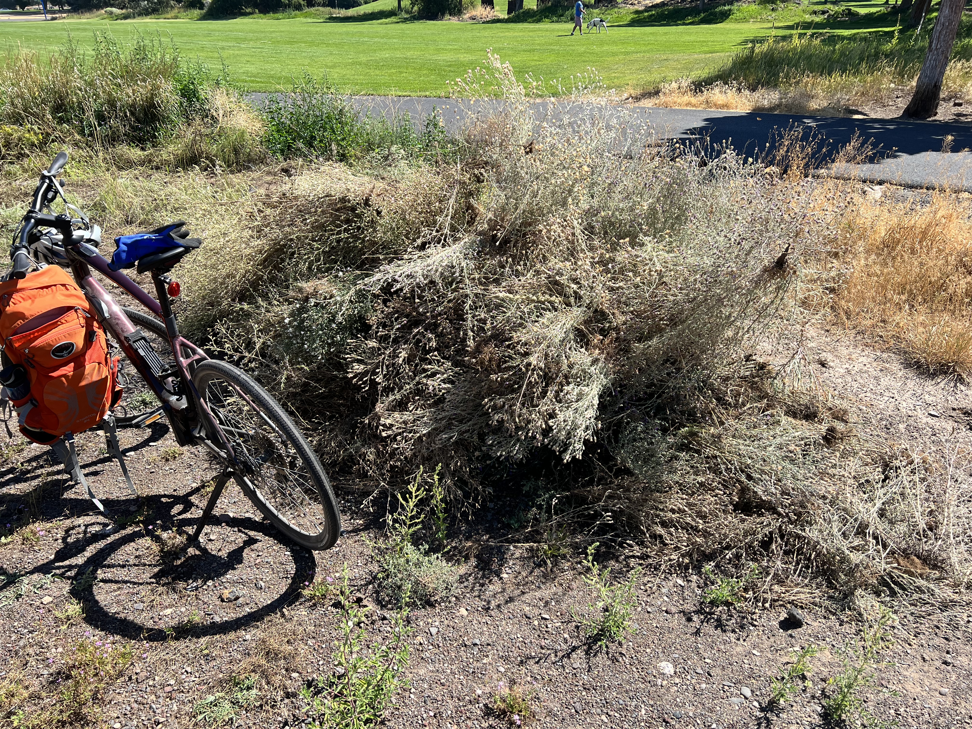 Landscapes such as Redmond’s Dry Canyon have been described by some with the vague term, ‘natural’, but make no mistake, this area is far from being an intact, healthy, native plant community. It is unstable, under the sway of many stresses and very vulnerable. The presence of Western Juniper, Big Sagebrush, Gray and Green Rabbitbrush, Bitterbrush, scattered patches and strips of native grasses and a few native wildflowers, does not make a viable native plant community. Especially when uncontrolled Steppe invasives are establishing. Intact native communities are somewhat resistant to invasion, but not invasive-proof, and those like Cheatgrass, the Knapweeds and others like Puncture Vine, Tribulus terrestris, are fully capable of invading intact communities here, hence their designation as ‘invasive’, a class, if you will, of supremely well adapted and aggressive weeds. Dry Canyon served as pasture which was grazed for decades prior to its service as a Park now with its pedestrian and bicycle corridors, amplifying and serving as conduits for weed movement. Paths penetrate the area, each bordered by the disturbed conditions in which these invasive thrive, aiding their spread along their length. Grazing, irrigation, the seeding of non-native pasture grasses and fire have aided and abetted the invasion setting the stage for today. Leaving such a landscape ‘alone’, ‘natural’, will not ‘allow’ it to return to its former state. It exists in a continuous state of disturbance. For progress to be made this disturbance must be countered with consistent, corrective action.