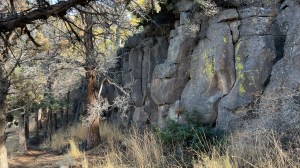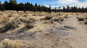 The canyon floor is variable, but as this pic shows, a solid layer of hardened lava underlies what soil is here, either blown in or washed in, a limiting factor on what can grow here. Rabbitbrush has moved in. Lava flowed multiple times from the Newberry volcano to the south, off and on over the last 400,000 years, first diverting the Deschutes to here where it carved the canyon out; then another flow which diverted the river again to its present canyon 4 miles west of here and then again, partially refilling the canyon here less than a 100,000 years ago.