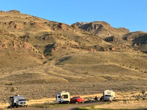 Wildlife knows its place here and sticks to them wherever they might be. We are the interlopers here taking the few roads wherever, whenever we want. We’ve bent the landscape as far as we can to suit our demands, taking by claimed right the water and resources we value and depend upon. Anything outside of those ‘lines’ are expendable. Even doing this our hold is tenuous, non-sustainable and one day our occupation will end. That which we demand is exhaustible and the land and its life is lessened in our taking of it, but for now, here the sound of birds and the wind vibrates and animates everything coursing across the spare landscape. Even Juniper are widely scattered, huddled together where they can, their roots having found purchase, resulting in spare cover. The sounds so common to us living in the 21st century in and around the closely linked towns and metropolitan areas, linked by roads, railroads, rivers and coast lines, corridors through the sky, all for the trade on which we have staked our lives, are few, temporal or all together absent. You can stop on any county road, graveled, without worrying about oncoming traffic, even stopped along the paved Hwy 395, your vehicle’s engine off, you can sit in silence for several minutes, mid-day, waiting for an interruption. Business and its consequent pace matches the activity and pace of human endeavor. Plush, a ‘hamlet’, 15 miles from this campground, has gas pumps and a single market, serving the most local of needs of the area. The largest town is Lakeview, 55 miles from where I sit, with 2,200 people. Waiting and acting are personal, much less imposed by others. By road, Bend’s 100,000 people, its businesses and supplies, are 200 miles away. To the south and east there is nothing comparable until you get to Boise, and that’s over 350 miles by car to the east or Redding, CA, 235 miles to the southwest….Most of the noise here is personal, that which we bring with us or the sounds of a camping neighbor walking across the gravel to the pit toilet. There are only 8 spots in the campground here including that of the host. Other than us, everyone else is in trailers, campers and a single motor home. Thankfully, I’ve heard no generators.