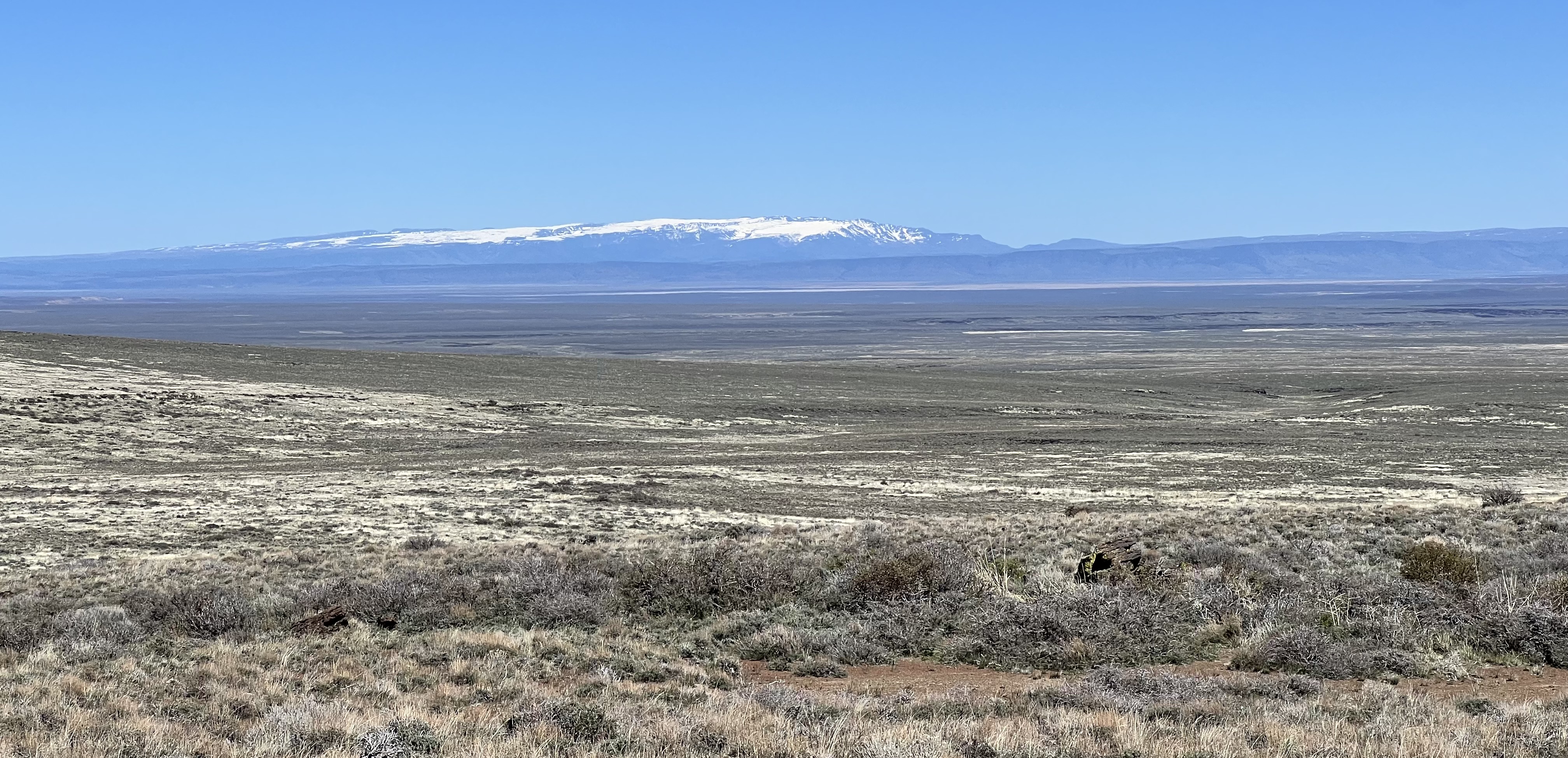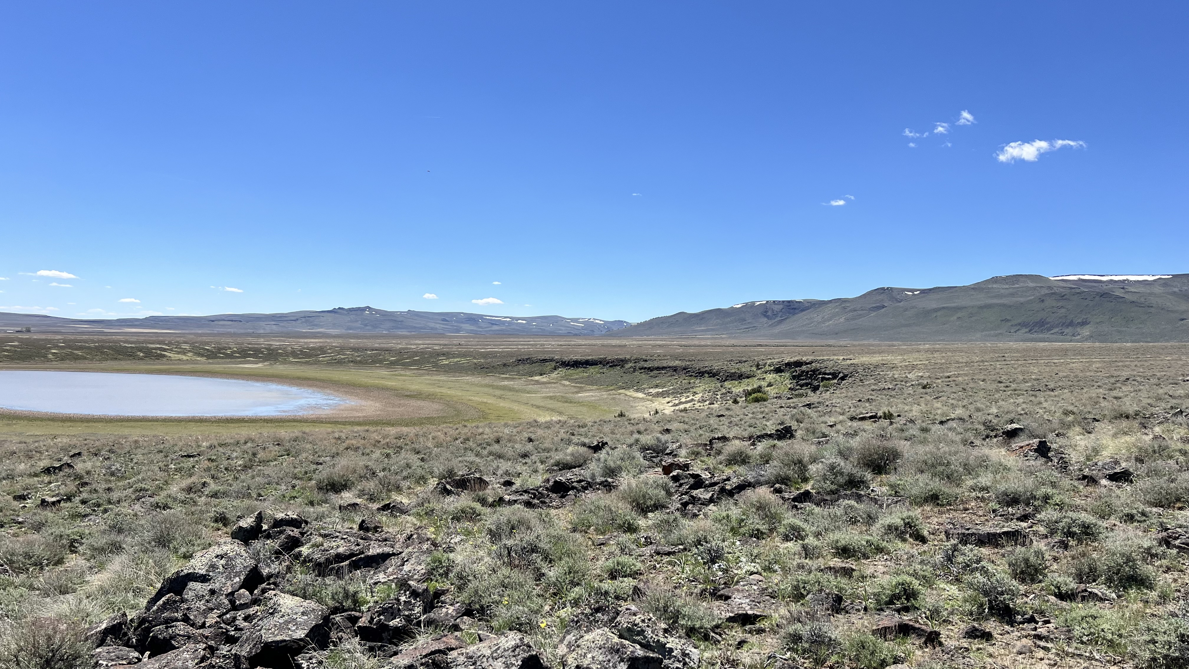 Looking south across Petroglyph Lake. To the far left, near the horizon, you can see the trees and headquarters of the Antelope Refuge. Roughly at the center of the picture is where the Hart Mountain Hot Springs are, just beyond the apparent ‘break’ in the mountains to the right.