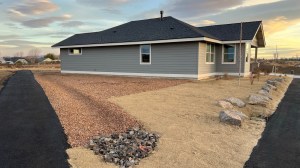 The ‘finished’ landscape, compacted, covered with rock and decomposed granite in front, nothing at all in the large, dirt back ‘yard’. The grade around the house is almost dead flat. Apparently, as this is desert, that’s not supposed to matter. When it did rain or snow melted quick enough, water would pool around the foundation in several places so we added gutters and a drain line from the near house corner to the rock ‘gallery’ in the foreground. We regraded the entire front and reset the larger rock in a more pleasing pattern.