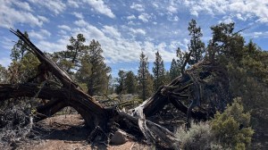 [This section of Hwy 97 has been designated by the state as the Redmond–Bend Juniper State Scenic Corridor, (who knew?) as a prime, and accessible stretch of ‘old growth’ Juniper, a forest with many trees over 150 years old, dating from before ‘our’ arrival and ‘disturbance’. Understand that 150 years old is still ‘young’ for a Western Juniper. There are over 600 acres of state and county lands that comprise it, much of which lie adjacent to much larger parcels owned/managed by the US Bureau of Land Management. These trees grow on land covered by the geologically recent Newberry volcano flows and are topped, if at all, by very young, wind blown and shallow soil.]