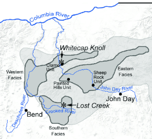 Map showing the distribution of the Clarno and John Day Formations in central and eastern Oregon, as well as the location of the three units of John Day Fossil Beds National Monument and other localities mentioned here. The Clarno Formation is represented by light shaded area, while the eastern, western, and southern facies of the John Day Formation are represented in darker shading. Map modified from Robinson et al. (1984) and Albright et al. (2008).