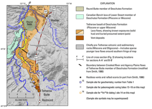 Round Butte, a small shield volcano just south and west of Madras, is associated with the late Deschutes Formation around 3 million years ago, contributing lavas that over topped all previous depositions. These are the rimrock basalts that ‘cap’ the rim above Cove Palisades State Park and Lake Billy Chinook, those of the far larger Tetherow Flow beneath it.
