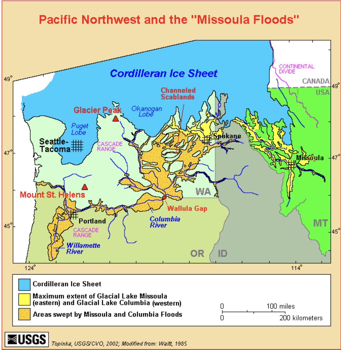 The Missoula Floods occurred between 15,000 and 13,000 years ago with the advancement of the last warming period of our current Glacial cycle. As the polar ice began melting it accumulated behind massive ice dams to the east of present day Washington state, trapped between the remaining ice and the Rocky Mountains to its east. Gravity will always win out. The floods occurred an estimated 25 times over that period and did so catastrophically. Many cubic miles of water would be released at these times in a matter of a few hours. Transforming the landscape of Washington state east of the Cascades, scouring away loose soil and carrying multi-ton boulders at its peak flows, taking with it anything living in its path, plant and animal, necessitating its repopulation from protected, nearby, higher elevation, refuges. Much more recently, estimated to have occurred around 1450, was the Bonneville Landslide which formed the Bridge of the Gods, an event witnessed by local indigenous people and passed along in their oral histories. The slide completely blocked the Columbia until its flow eventually breeched and swept it away. The slide took with it the southern face of Washington’s Table Mountain a part of the blocking Cascade Volcanic Arc.
