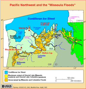 Glacial Ice is that which doe not melt from year to year accumulating over the centuries. Today glacial ice covers 3% of the Earth’s surface and about 11% of its land area. It is estimated that if the remaining glacial ice melts, due to man imposed climate change, that the oceans will rise another 230’. During the last Glacial Maximum, between 26,000 to 13,000 years ago, the ice extended south to approximately 45º North, roughly our own latitude, a line that varied with topography and broad climate patterns around the globe. True then as it is now the oceans moderate temperature extremes, the sustained cold reaching further south across the interiors of the larger continents. Here in the PNW glacial ice extended down through the Puget Trough in present day Washington reaching as much as 2 to 2.5 miles thick. It did not, however, extend down into central Oregon. It did not carve away our local landscape. The relative cold did greatly effect our local plant communities which would have likely resembled the northern boreal forest more than it does our present sagebrush steppe, with average temperatures lower and moisture levels somewhat higher.