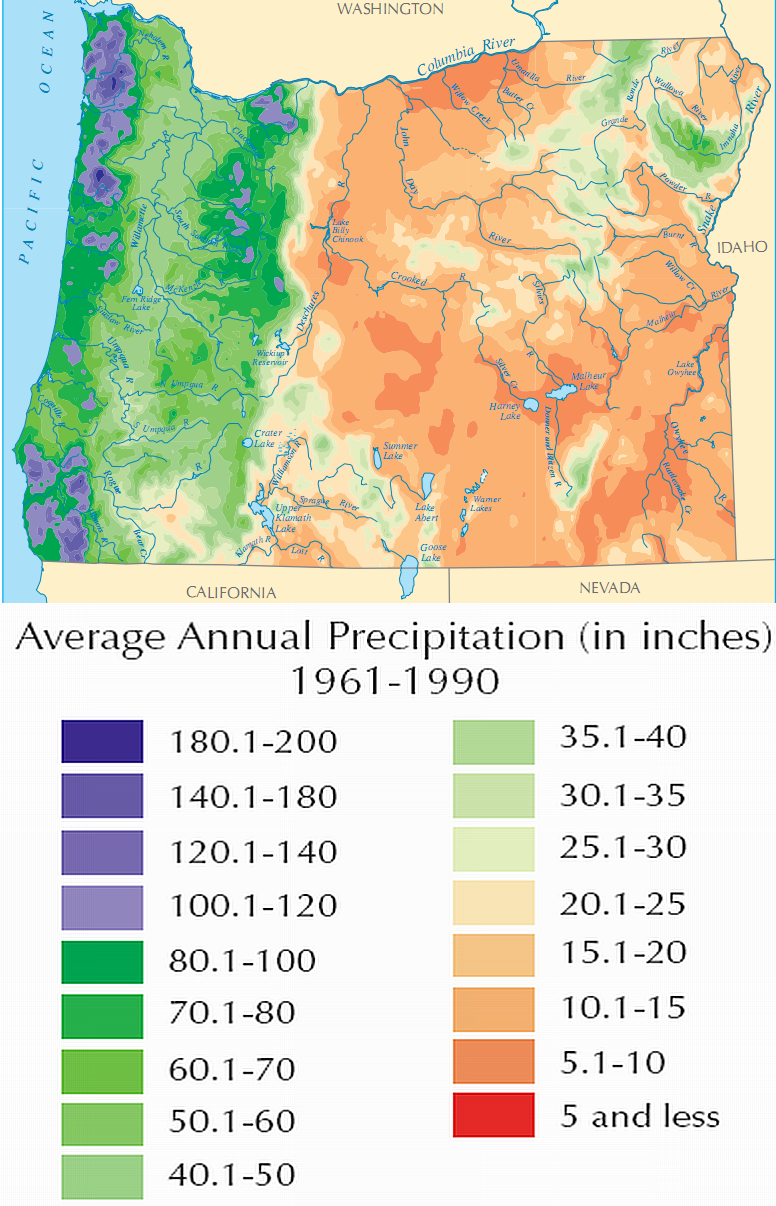 This maps shows no cities or roads, or counties. Redmond is in the dark orange (5.1″-10″) blob, just south of the confluence of the Crooked River with the Deschutes. Bend spreads out 15-20 miles to our south, in the ecotone where the 10″-15″ and 15″-20″ zones come together, where the Ponderosa Pine overlaps with the Juniper and begin to dominate (The eastern portion of Bend lies to the dry side of the ‘line’ in the Juniper forest). Sisters is 20 miles west of Redmond in the ecotone/edge it shares with Bend, getting quickly wetter/greener as you continue west. Prineville lies in the next zone drier about 20 miles east of Redmond.
