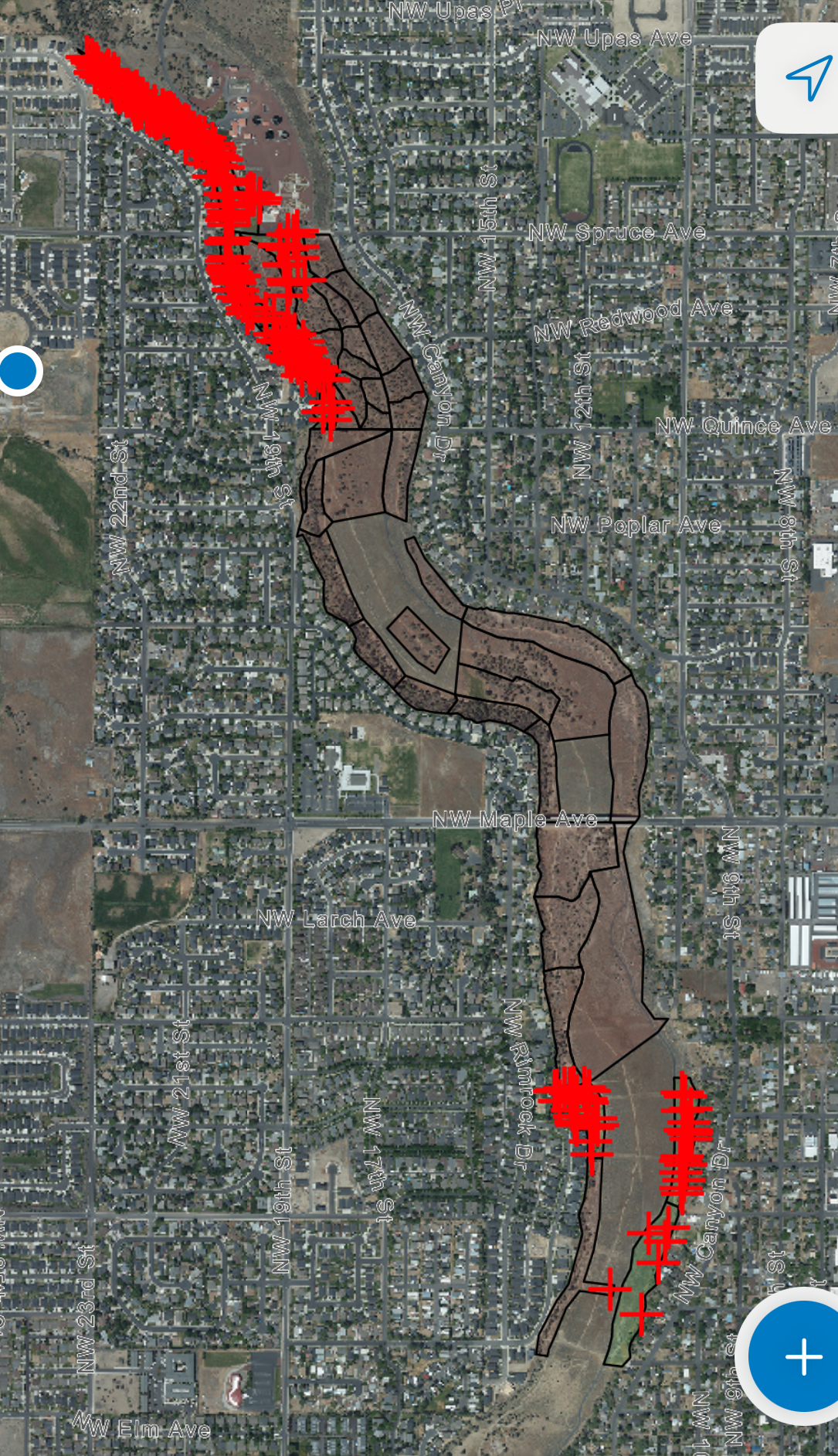 This shows the entire area of the North Dry Canyon natural area. Each red cross represents a single juniper tree of 18 inches or greater at breast height, DBH. after a training run around the waste, water treatment plant we began from the south end just north of the first street stairs before skipping across the canyon to the area immediately below West Rim Park. The black lines that you see cutting up the canyon floor define polygons areas created by the cities GIS staff to to help us break up the entirety of the project into chunks that made sense as you worked on the ground.