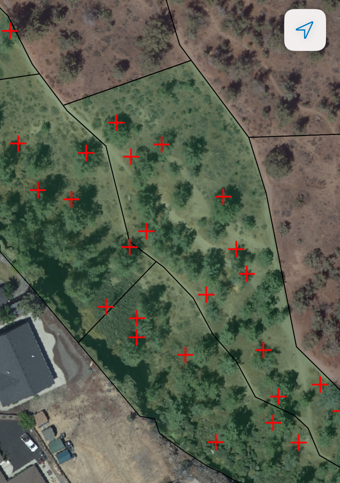 Here you can see the black lines that define the polygons we’ve been working on. When we complete the polygon and upload it to the City’s GIS that polygon is overlaid with a green tint. Those polygons we haven’t surveyed yet appear as brownish. You can also see in this picture that many or even most of the trees that appear in the aerial photo are unmarked by a red cross. That is because each of these unmarked trees are smaller than the 18 inch DBH that we set as the minimum.