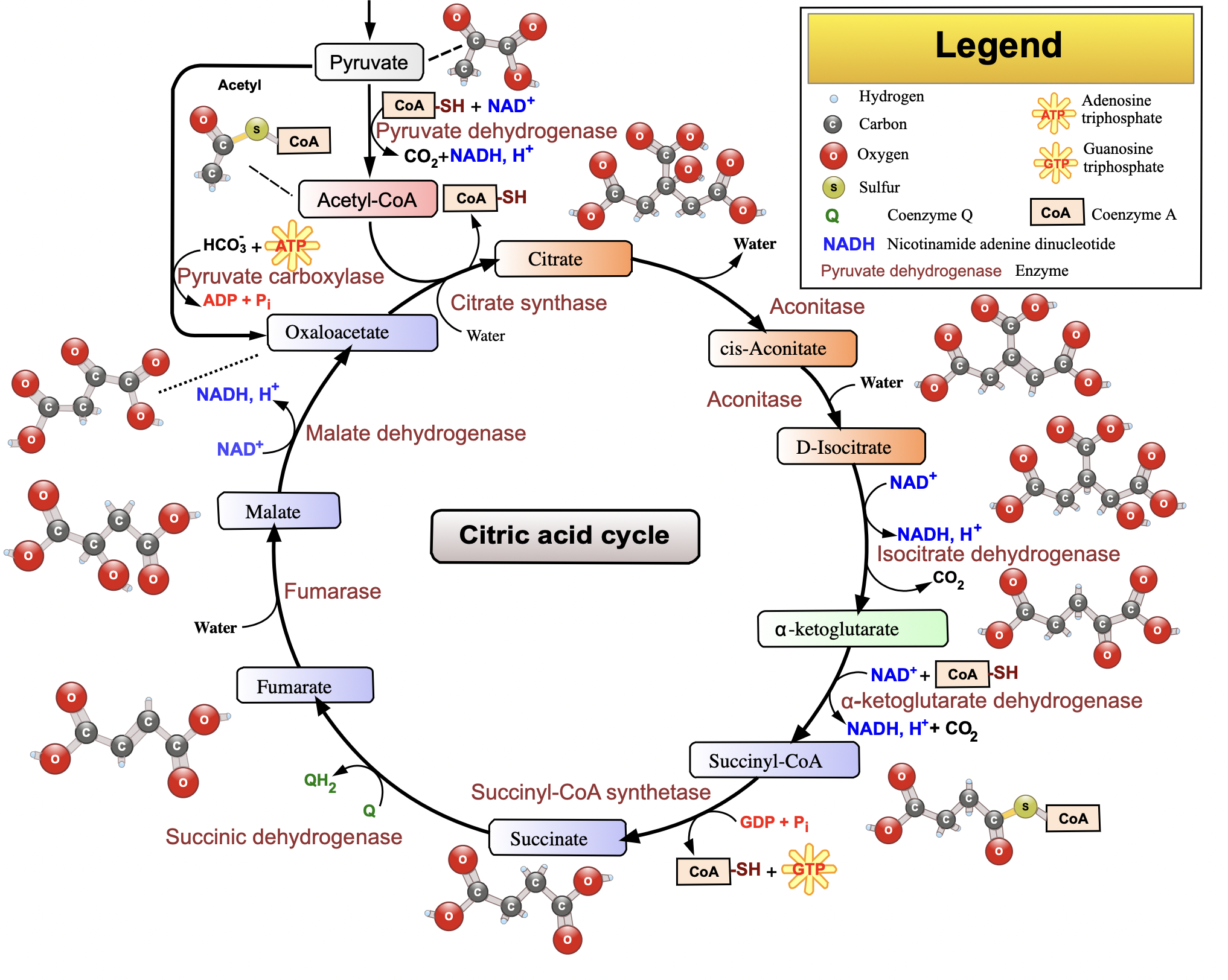 I include this as a more complete illustration of the Krebs or Citric Acid Cycle. This is representational, a prompt to aid students in remembering the products of its process. Reality is far more complex than this circle suggests. Lane’s own diagrams are considerably more simplified version of this. I include it to give you some idea of the complexity of the process. Sugars aren’t simply burned in cells to power an organism like gasoline in an engine. Don’t expect to see a neat assembly line structure within each cell. Life does not follow our narrow plans for efficiency, but its processes and timing are finely tuned, near perfect by life’s own measures. ‘Following’ the cycle in the diagram shows where some byproducts are spun off, where the reenter, are used and transformed again for reused. It is highly conservative in this way.