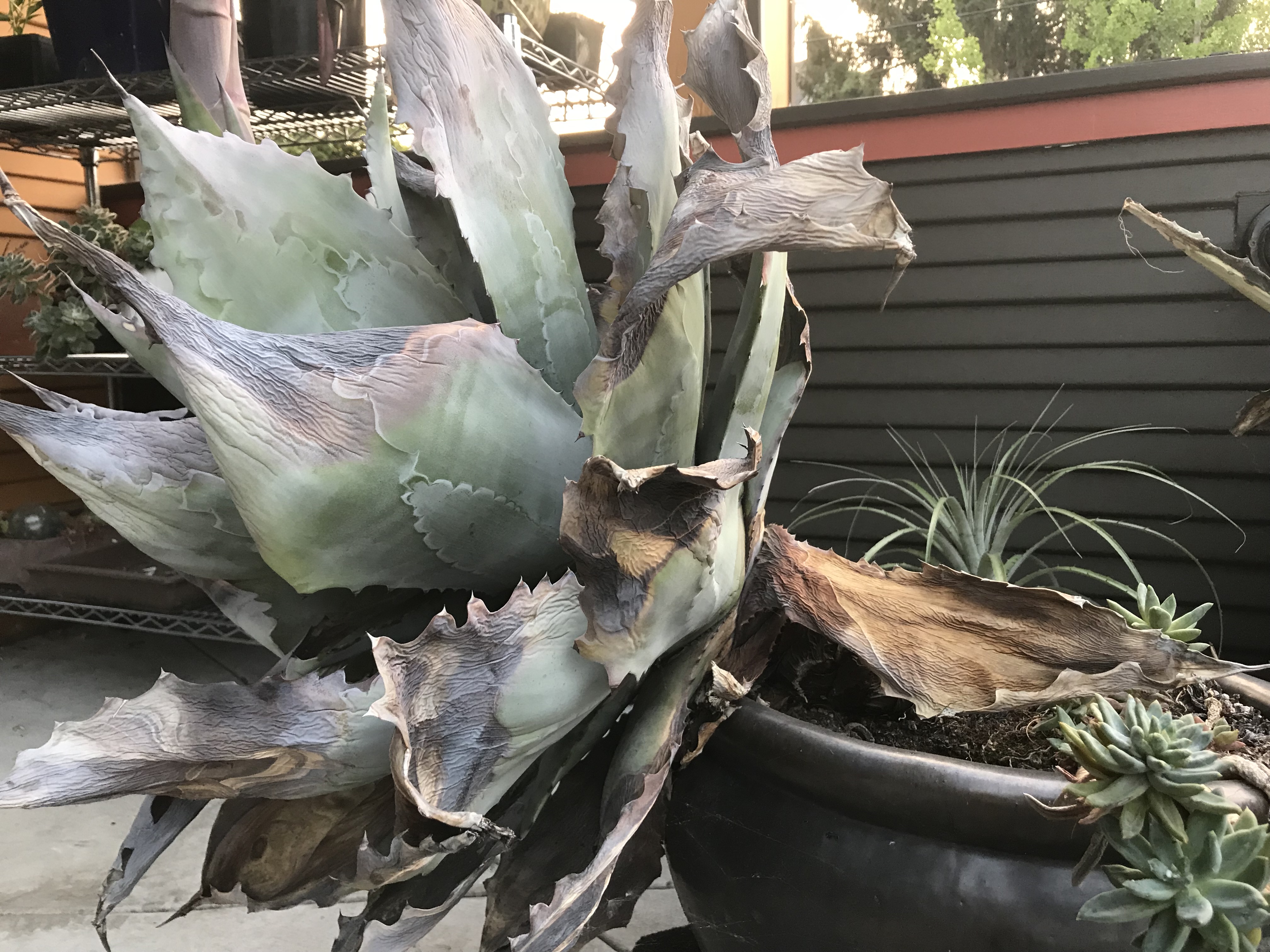 Aug. 10, 2018 This shows the center of gravity problem! Growing in the ground, such as the plants at Boyce-Thompson the crowns were supported by the ground and had a less pronounced ‘lean’. The desiccating leaves, especially the lower ones, is already well advanced here, to me indicating a lack of reserves having lost so many leaves over the years from which to draw, especially given that there is not any prominent ‘heart’ tissue.