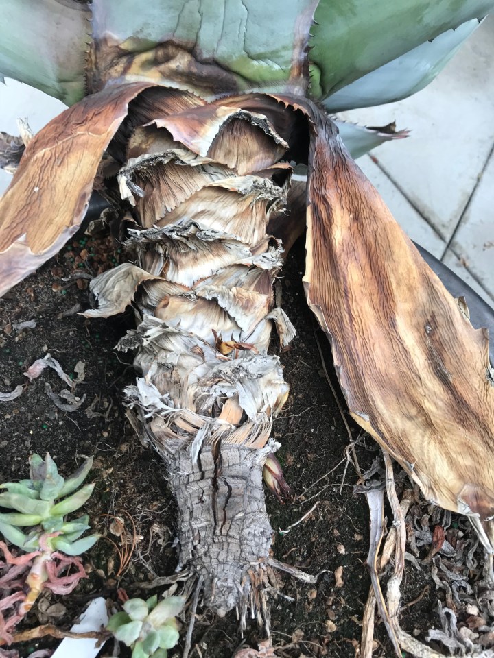 Aug. 26, 2018 I could have taken a similar picture anytime over the last several years. The stem is completely prostrate. You can see dried leaf bases lost over the years. A different angle would have shown additional rooting along part of its length.