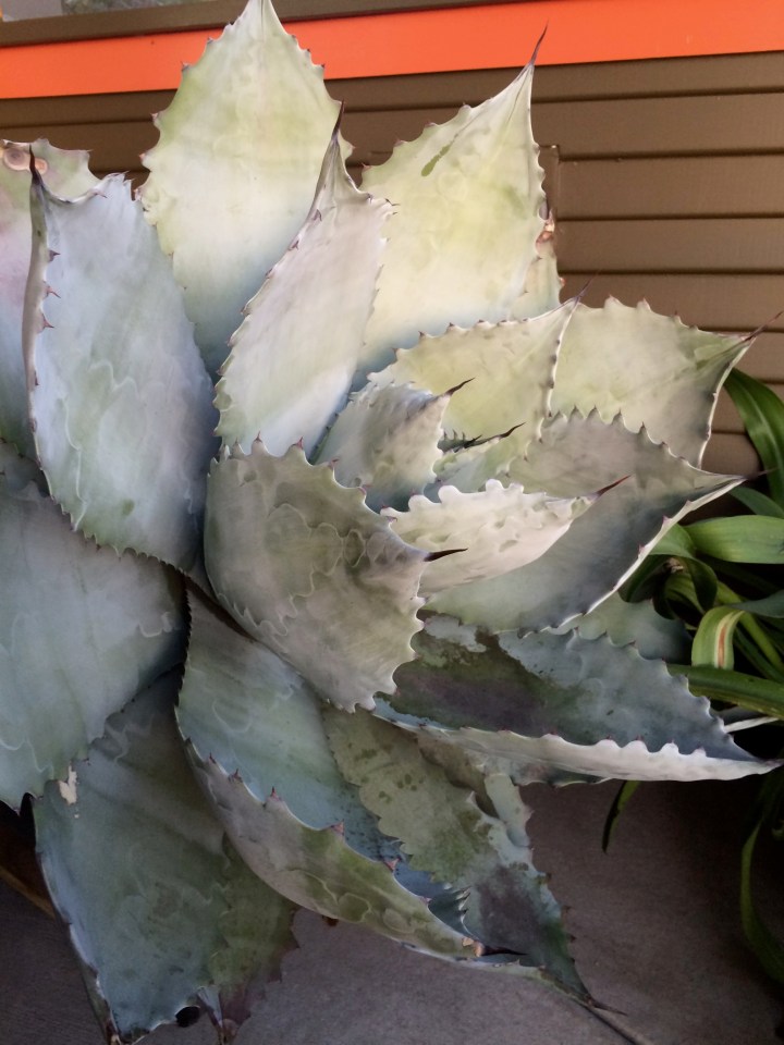 Agave colorata before flowering initiation, growing nearly horizontal, with a broadly cupped lower leaf holding water. From the Irish’s book, “Agaves, Yuccas and Related Plants”, “The leaves are 5-7″ wide and 10″-23” long [mine were all at the small end of this range] They are ovate ending in a sharp tip….The leaves are a glaucous blue-gray and quite rough to the touch. The margin is fanciful with strong undulations and large prominent teats of various sizes and shapes. A very strong bud imprint marks the leaves, which usually are crossbanded, often with a pink cast [not mine], and end in a brown spine 1-2 in. long.