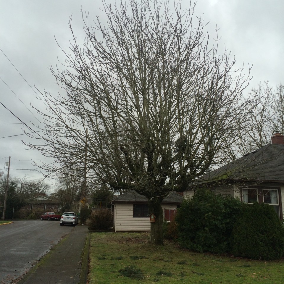 According to Phyllis Reynolds a few years ago this is one of the largest Magnolia macrophylla in the City, it has a dbh of around 18″….but, it has been heavily and badly pruned over the years with many hard heading back cuts with consquent heavy resprouting. Magnolias tent to be fairly strongly upright growing trees. This one has been ‘forced’ sideways and then had those limbs headed back. The tree is still trying to grow in its genetically driven form.