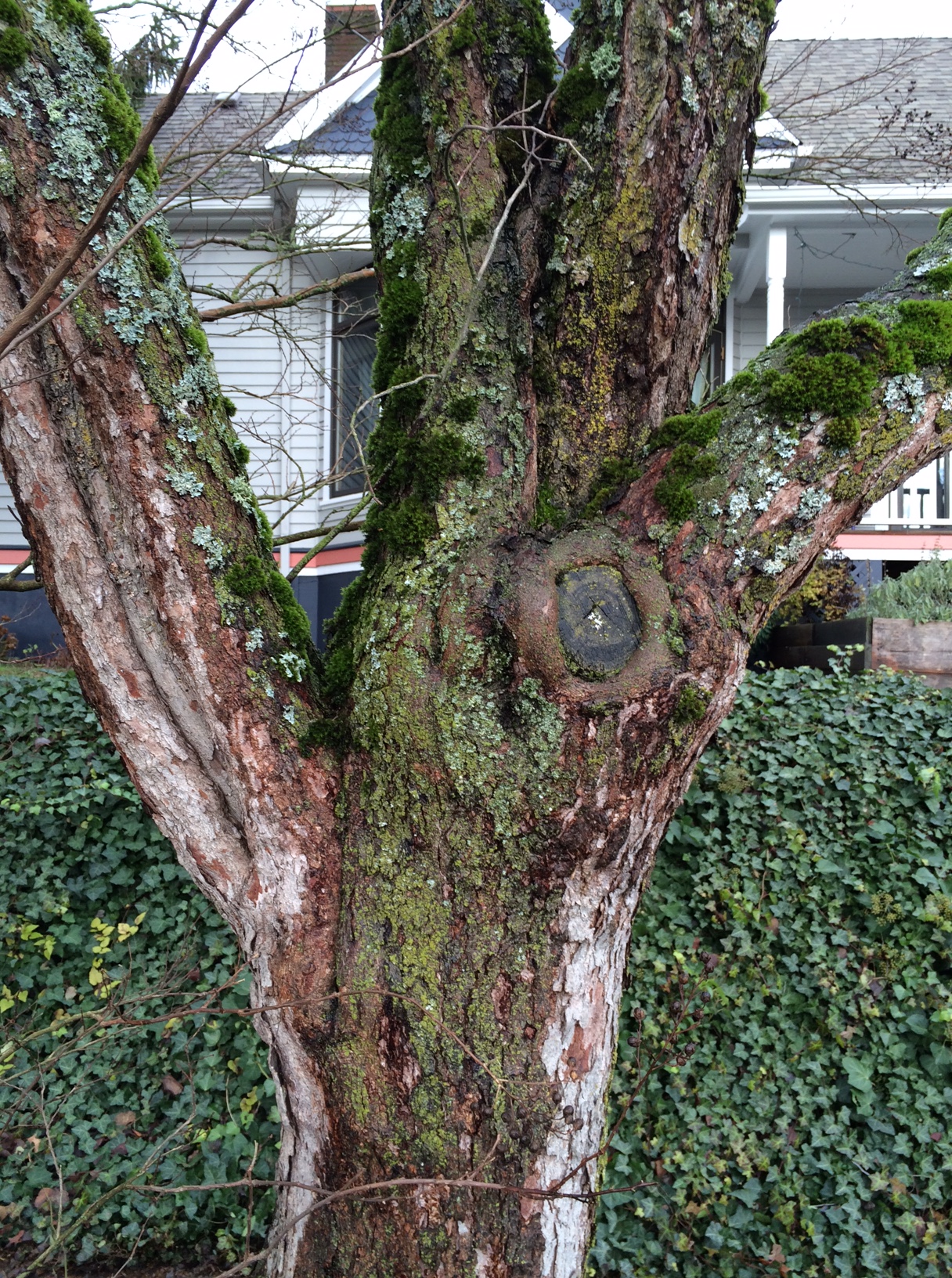 This Cercis canadensis survives its partner that declined, broke and was removed a few years ago. It’s about 12″ dbh and has suffered a few branch failures/tear downs itself each with a long scar left on the trunk. All of the main branches, including the two failures are/were within a foot and a half of each other along the trunk weakening the structure. The two verticals, top center share a long joint of included bark. The branch to the left also has a weak angle of attachment with a long ridge running down demarcating it. One branch was removed in the center more recently after having been broken by a truck. Were all of these major branches spread out more up the trunk the tree would be stronger.