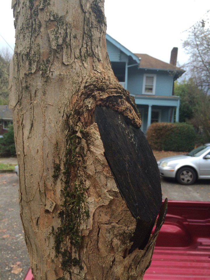 A good example of a bad ‘cut’. The pruner was removing what was likely a comepting leader which was of a diameter similar to the remaining trunk and was attached at a fairly vertical angle. The cut’s probably at least two years old and there’s only a little bit of callous forming near the top. The cut was made almost flush with the trunk disrupting the entire ‘collar’. The cut is very close to the ‘ridge’ and the surface, the cross-section, is elliptical in shape…it was not made perpendicular across the branch. The bark is dying and pulling away from the dead trunk tissue beneath it. Remember the collar is the zone around the base of every branch which is able to best develop callous tissue and close the wound.