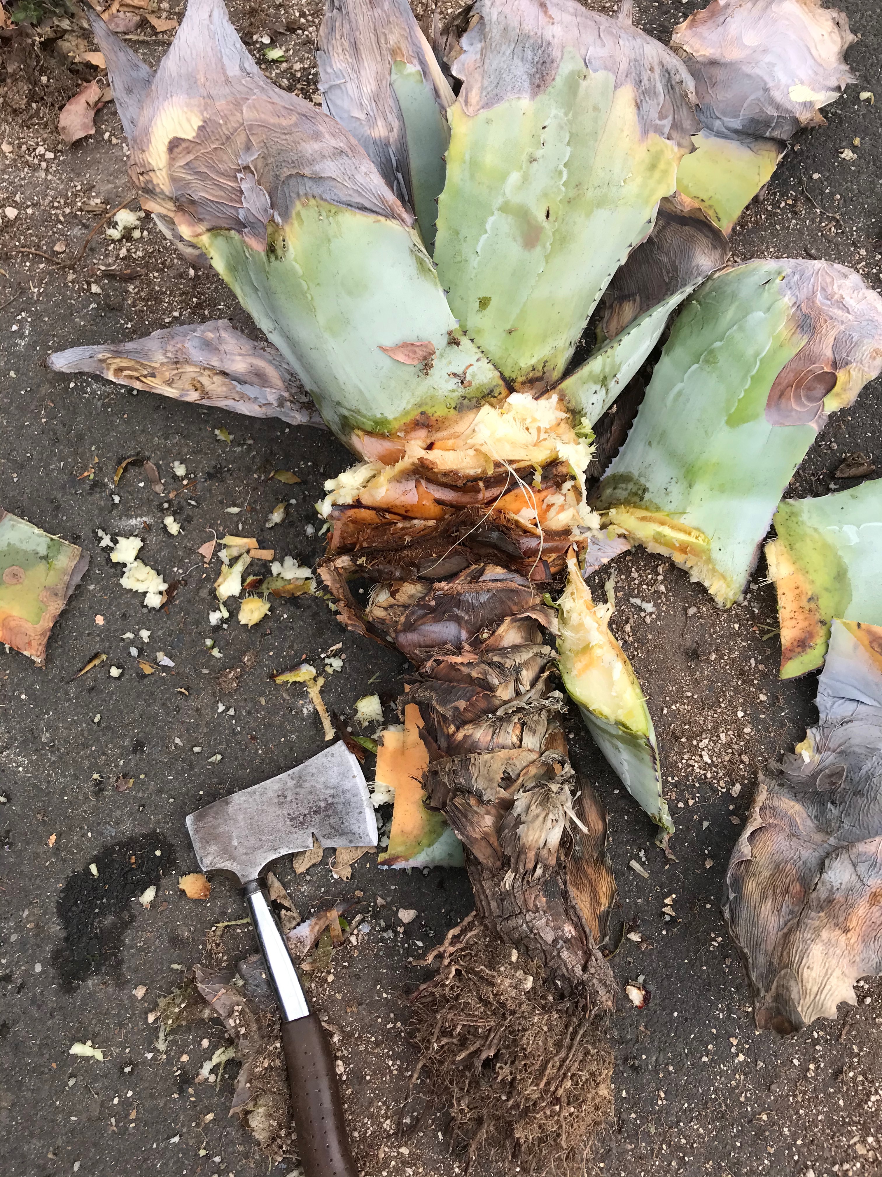 After sitting around out of the ground all summer, I took a hatchet to it to better see its ‘heart’. There really wasn’t one, only a slightly thicker stem. The leaf bases were still very thick and fluid filled! There had been no additional leaves produced…it was just ‘waiting’.